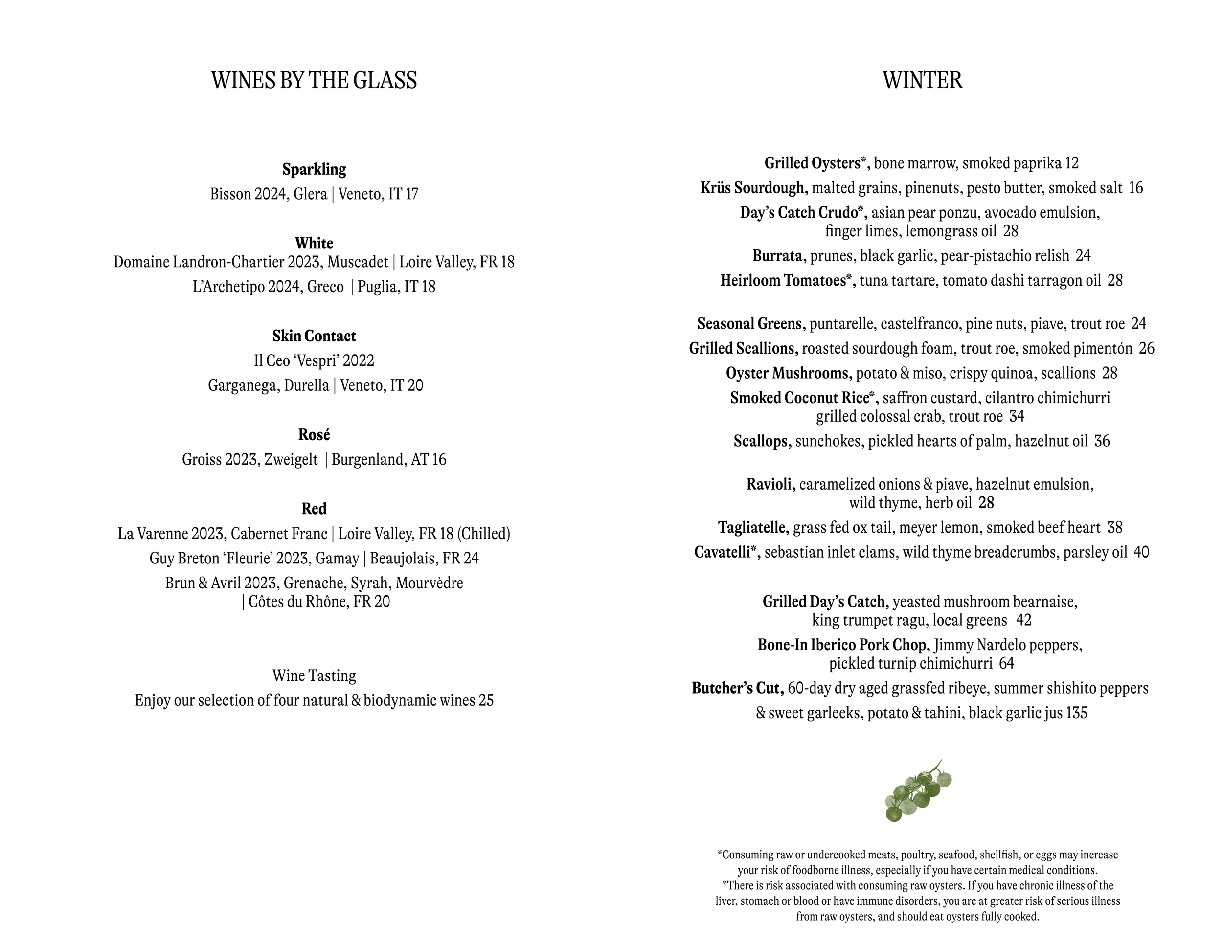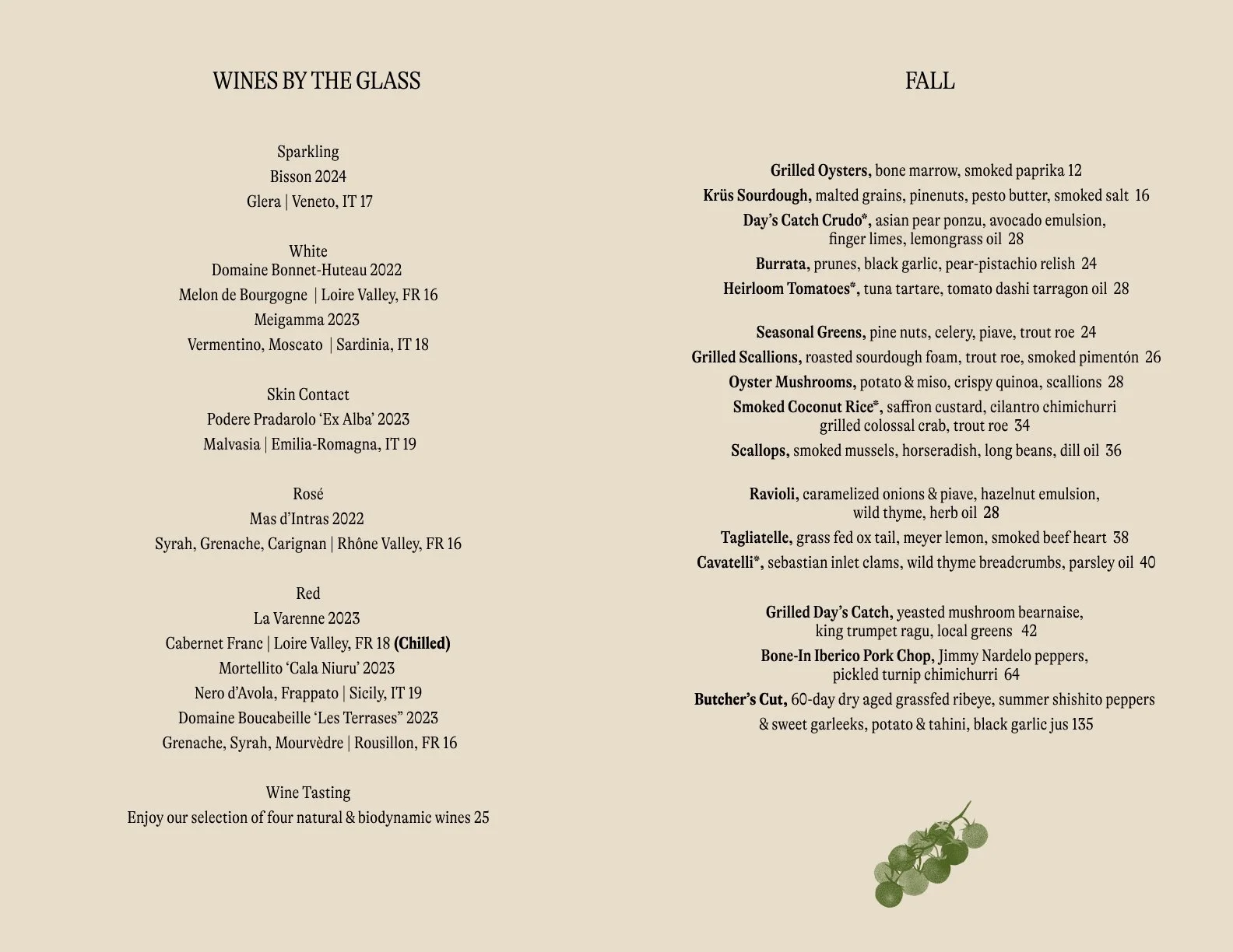 At Krüs, the menu flows with the seasons—thoughtful, ever-changing, and rooted in connection. Hand-rolled pastas, daily baked breads, and vibrant vegetables from local farms share the table with consciously sourced meats. It’s a reflection of our values: nourishing, communal, and deeply intentional.