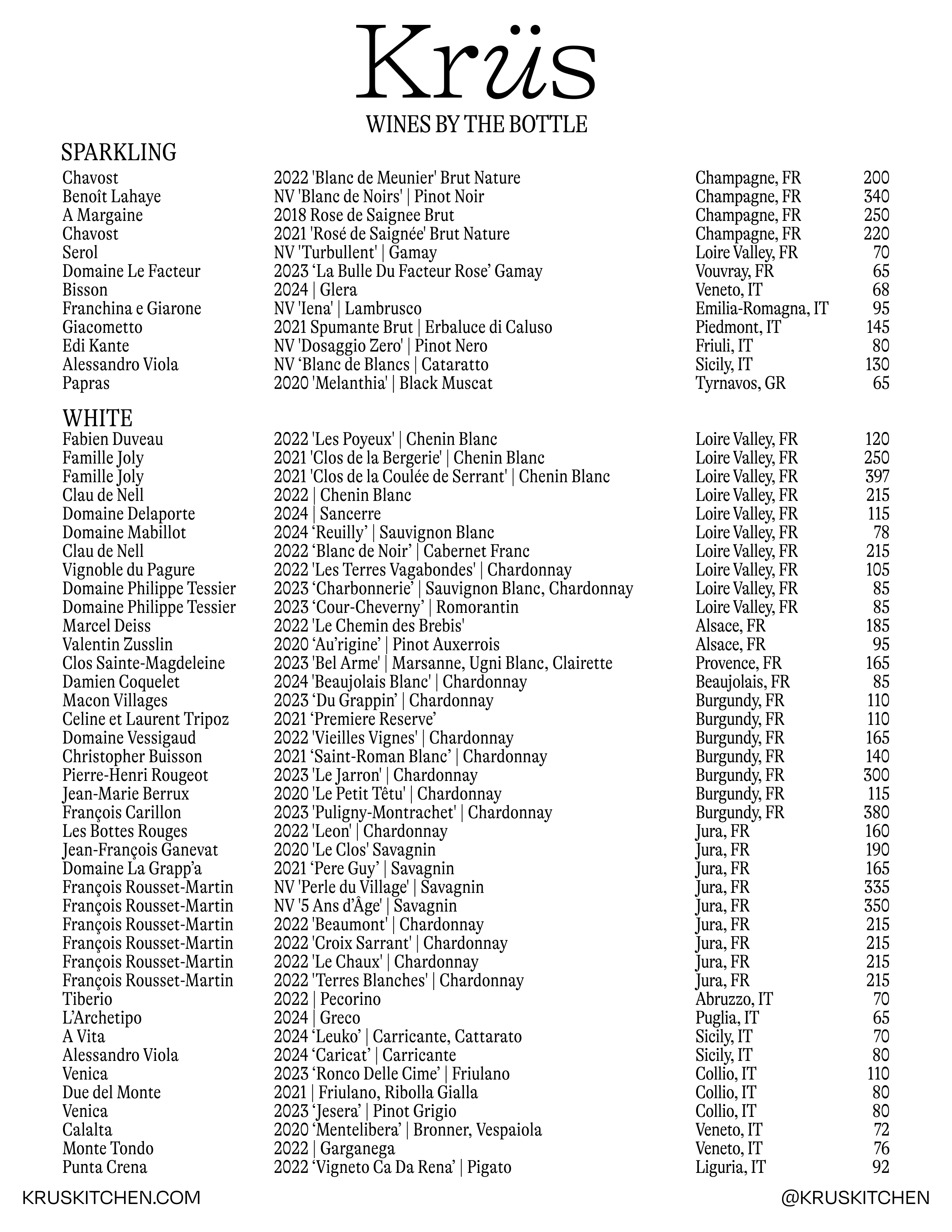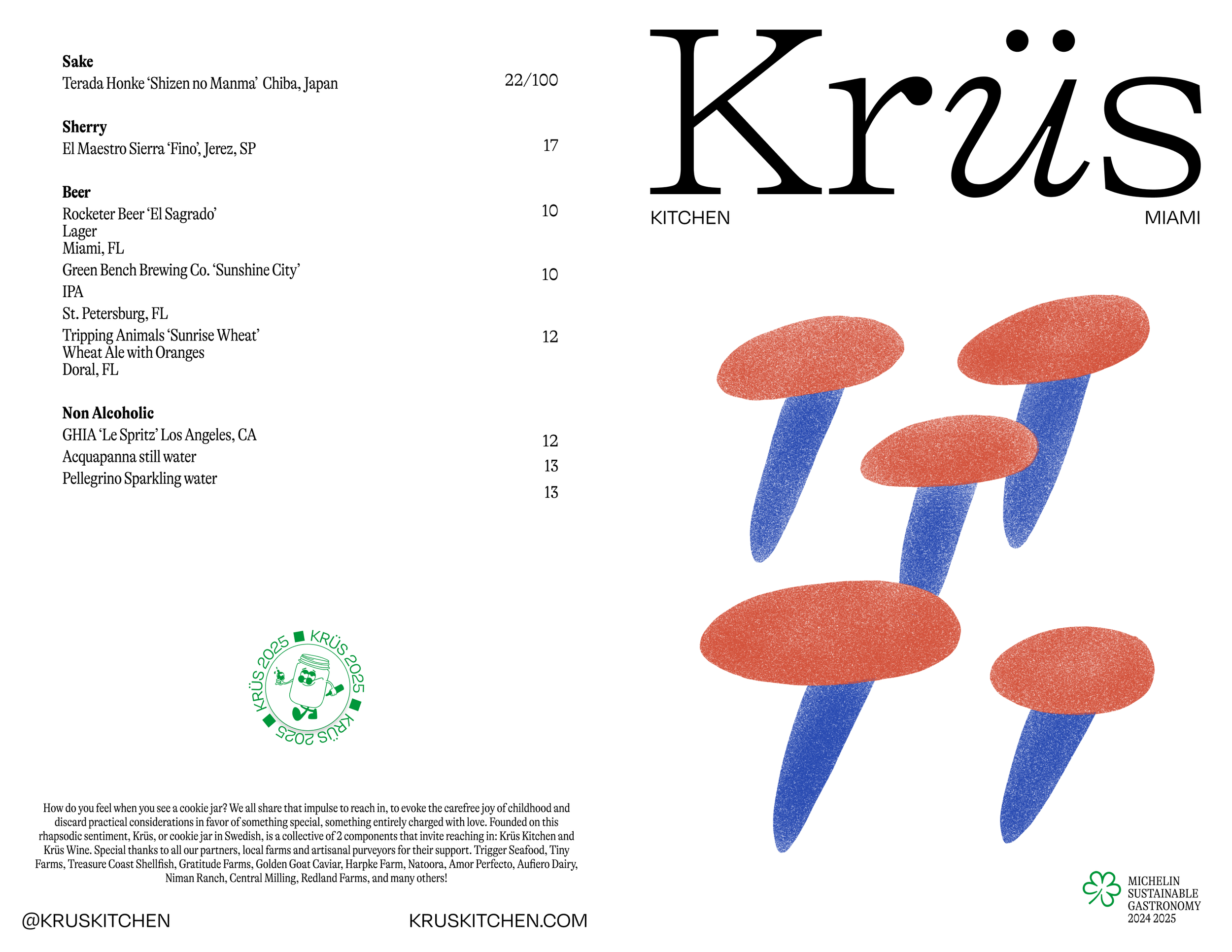 Tucked in the heart of Coconut Grove, Krüs is more than a restaurant—it’s a gathering place. Our natural and biodynamic wine list is its own journey: elegant, unexpected, and always evolving. Sip in-house or take a bottle home.